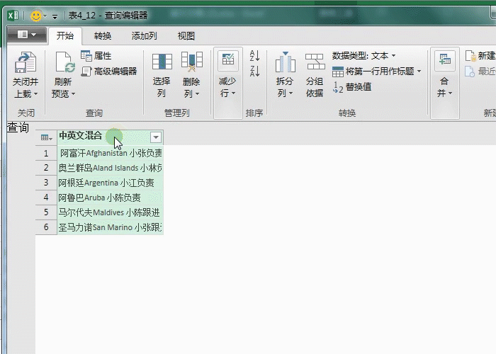 和提取英文一样的方式,公式不同,提取中文需要使用公式=Text.Remove([中英文混合],{"A".."z"})